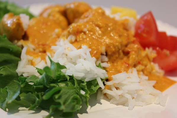 Chilikyllingen ble servert med kokt ris, crispisalat, tomat og mango.