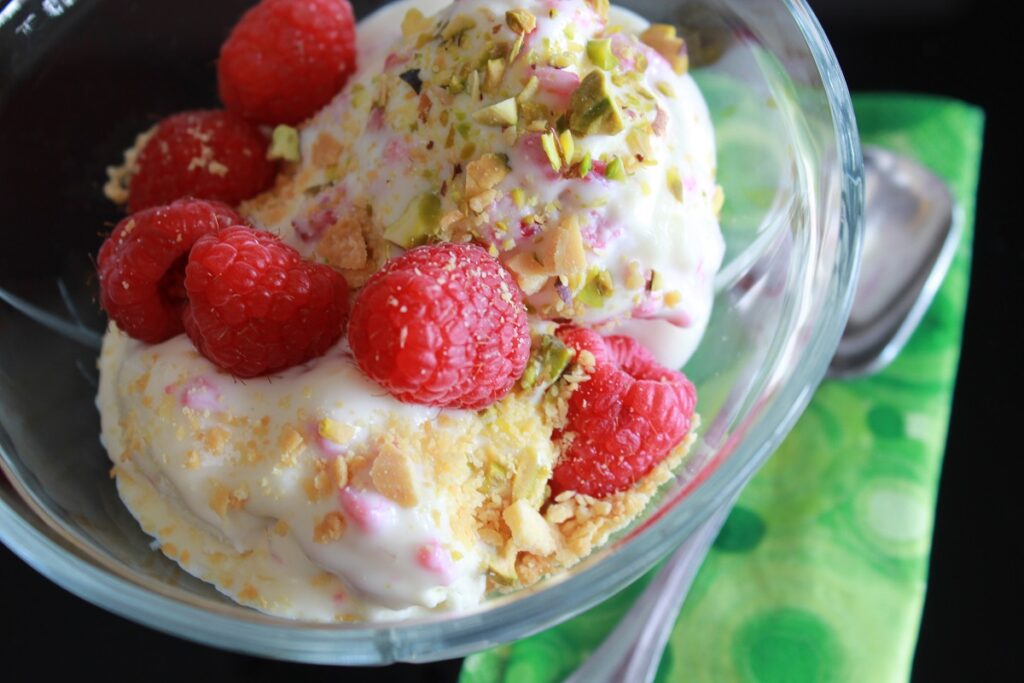 Hjemmelaget iskrem med bringebær og hvit sjokolade