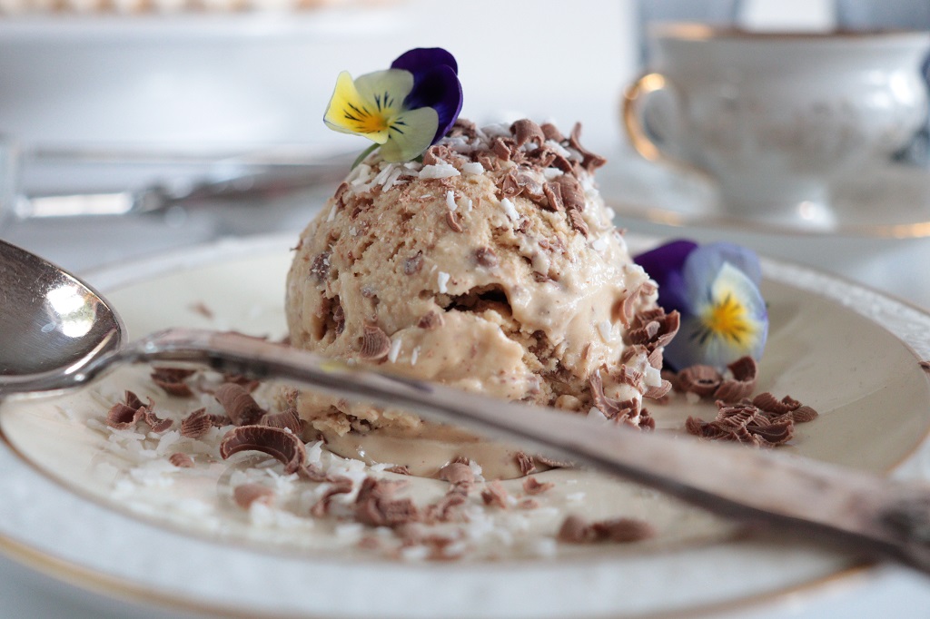 Hjemmelaget iskrem med kokos, revet sjokolade og kanel er laget av