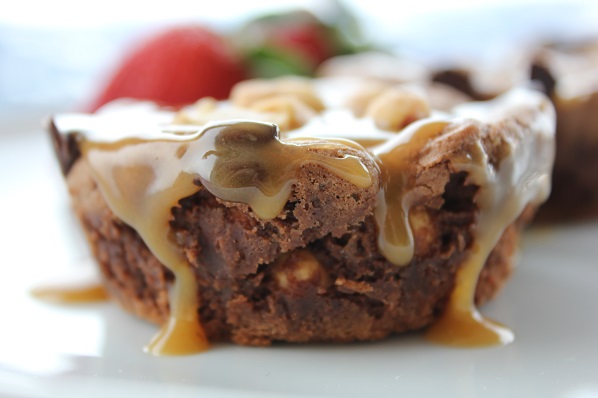 Peanøttbrownie med karamellsaus ble inspirert av et par kolleger som koste seg med en brownie