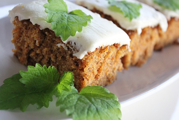 Saftig gulrotkake med varm smak av krydder og søt kremostglasur.