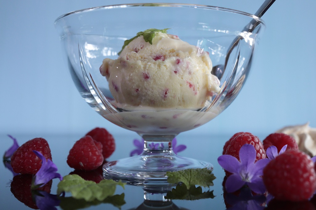 Hjemmelaget iskrem med bringebær og revet marsipan. Søtt og syrlig på en gang. Etter å