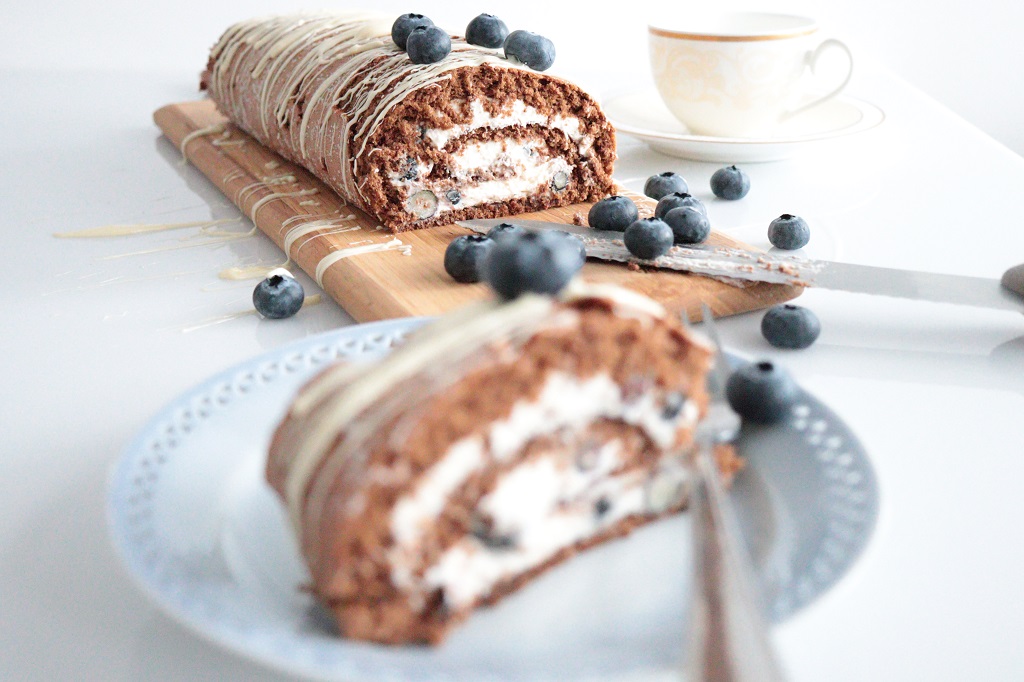 Cappuccinorull med vaniljekrem og blåbær – Rullekaken med kaffesmak. Etter å ha lekt litt med