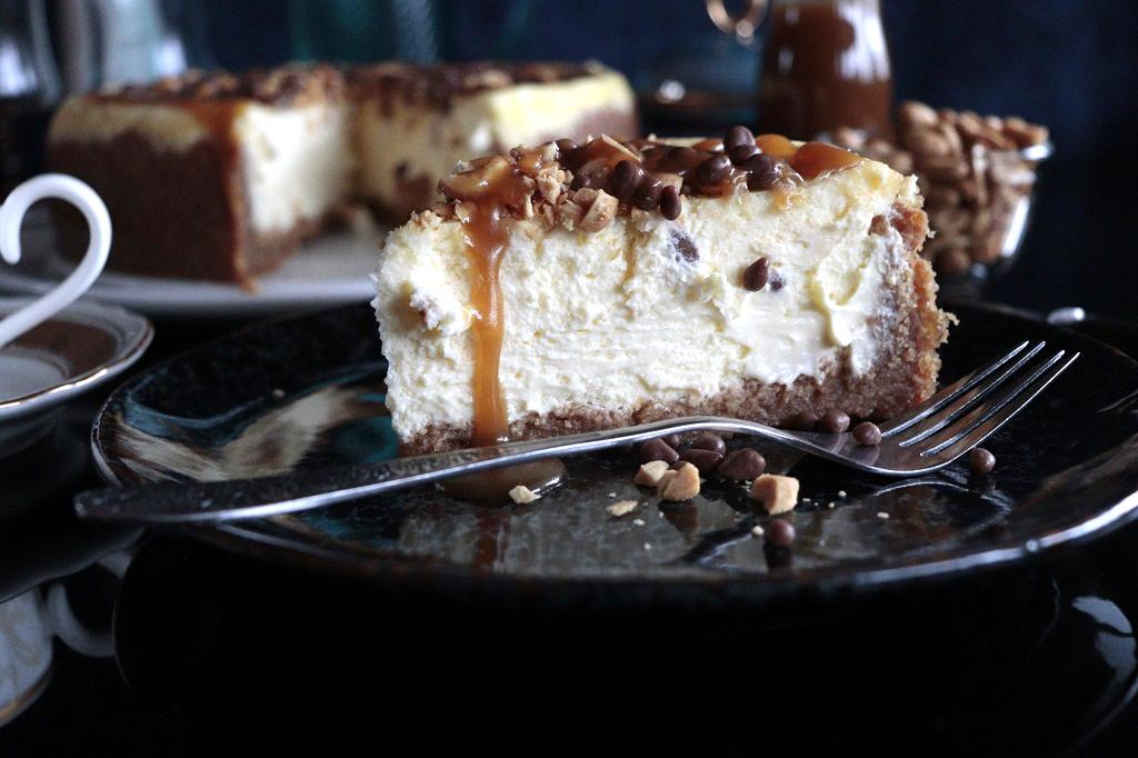Ostekake med karamell og peanøtter. Denne ostekaken kan kanskje også gå innunder kategorien «Snickers ostekake»,