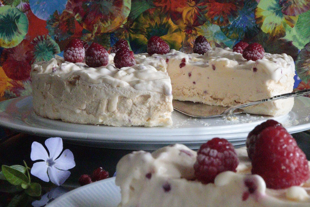 Pavlova med bringebær – denne ble til ved et uhell. Mislykket planlagt mousse på Idéfull.no,