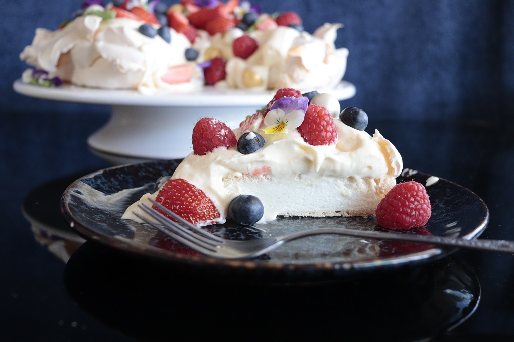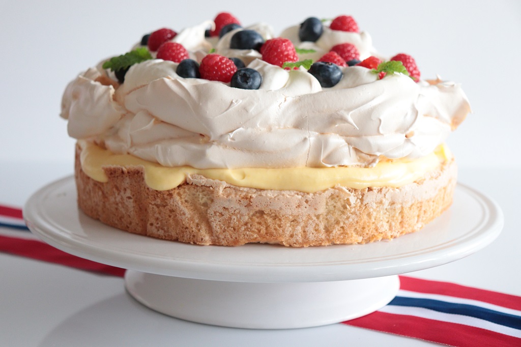 Lett og luftig pavlova med sprø marengsbunn, myk kjerne og toppet med krem og friske bær.