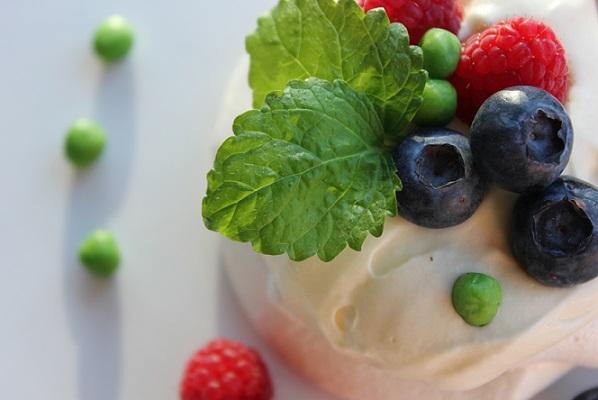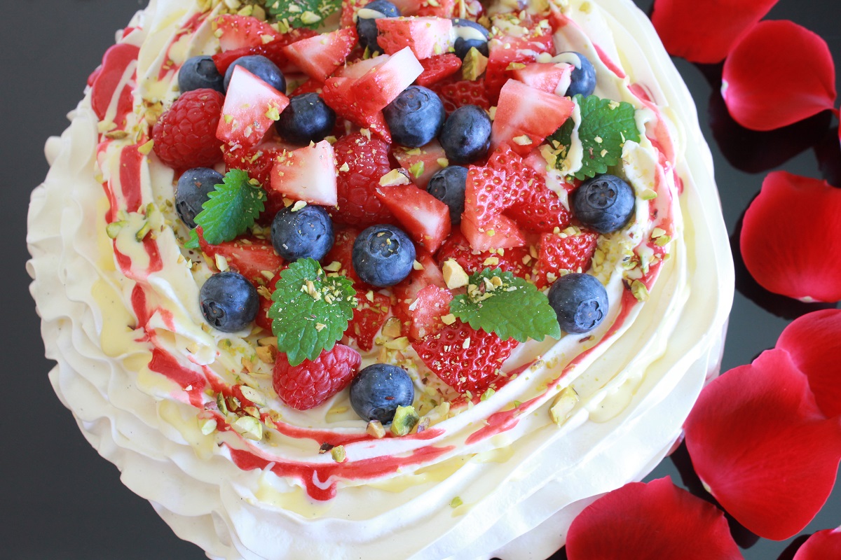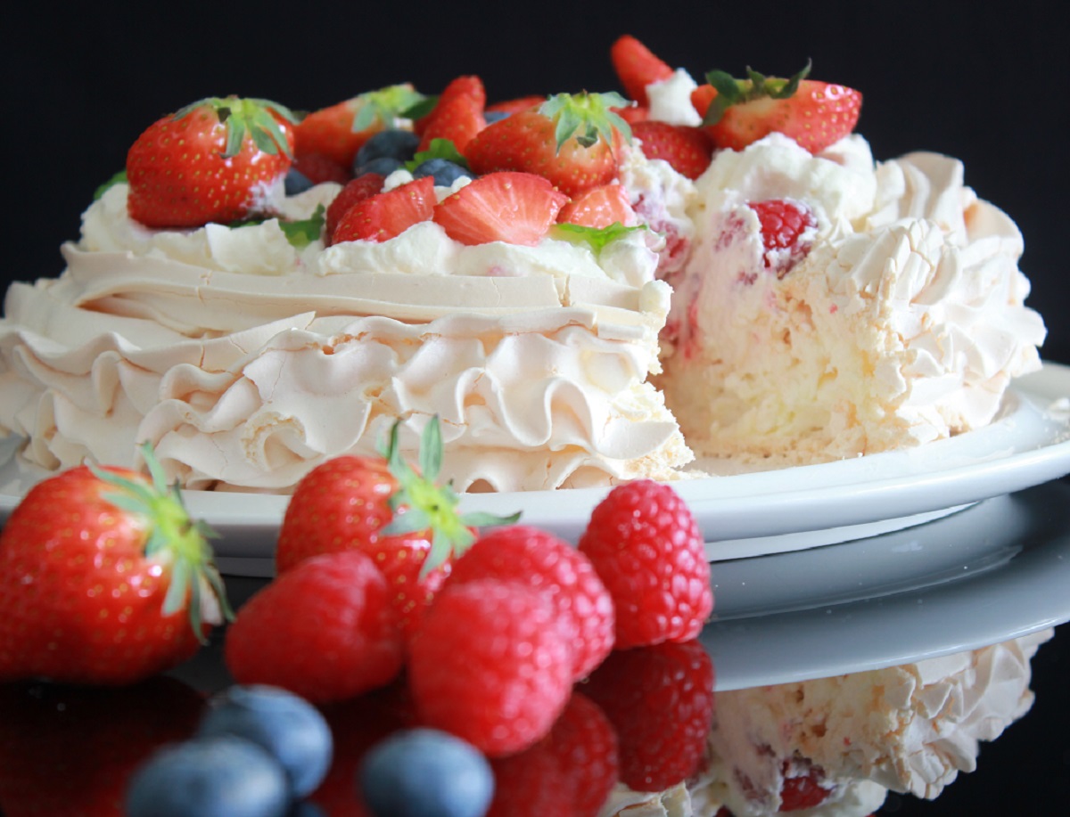 Lett og luftig pavlova med sprø marengsbunn, myk kjerne og toppet med krem og friske bær.