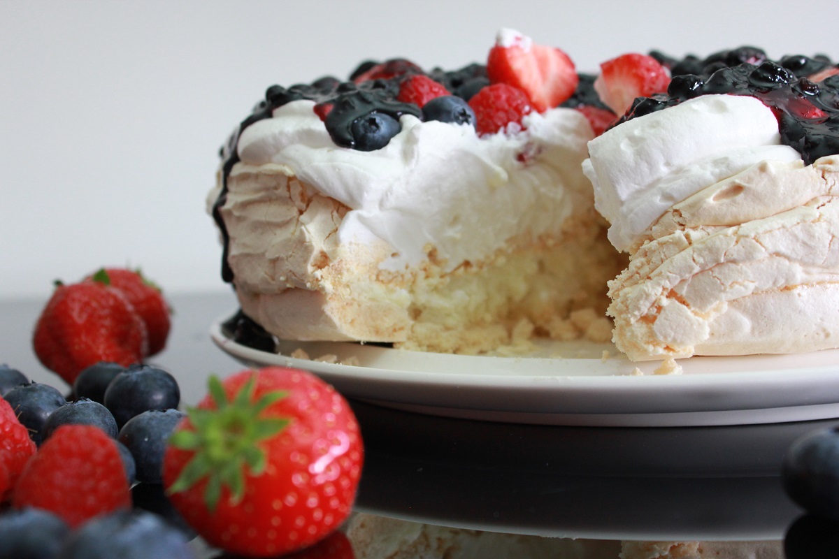 Denne Pavlovaen med friske bær og blåbærkompott ønsket jeg å prøve å få så høy