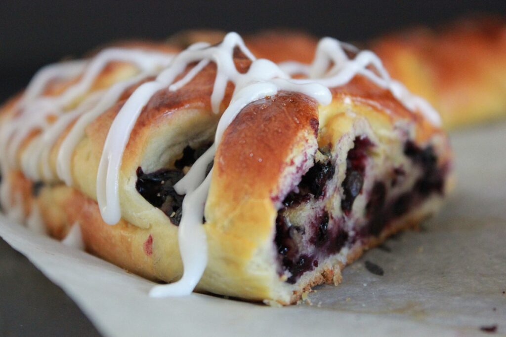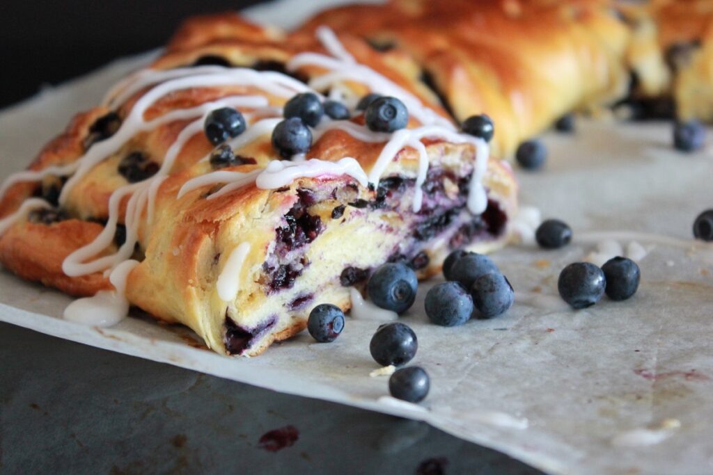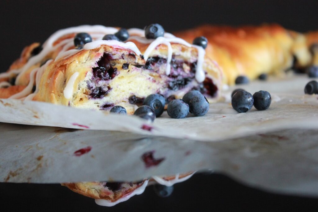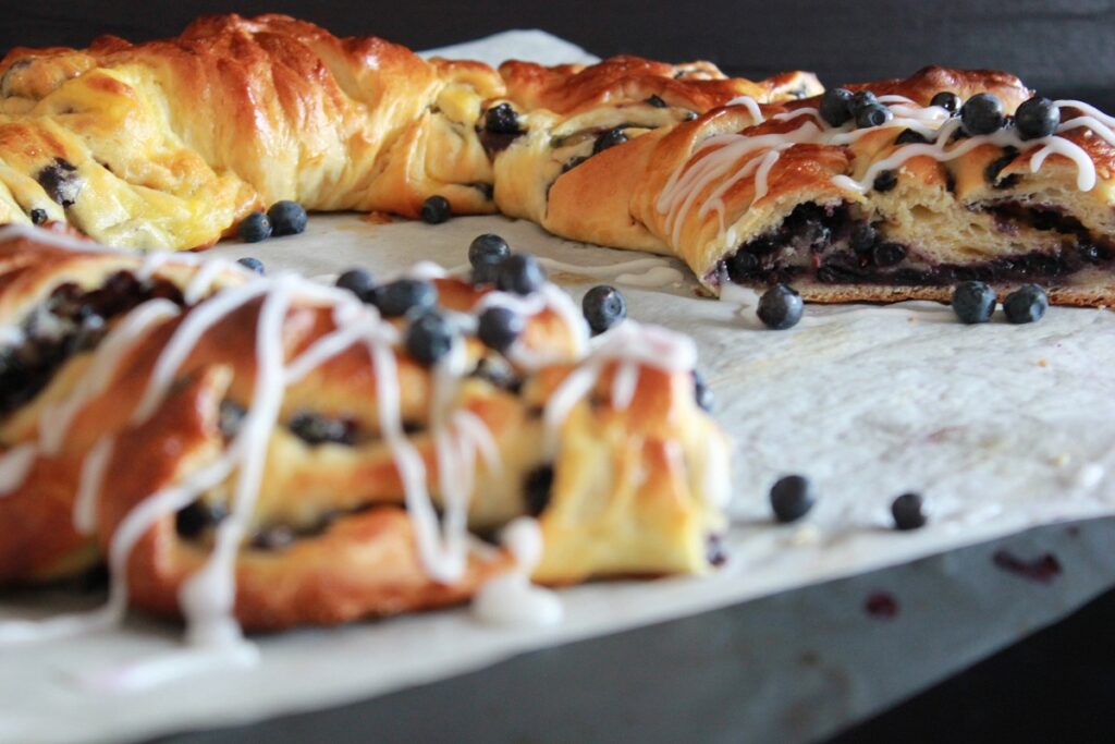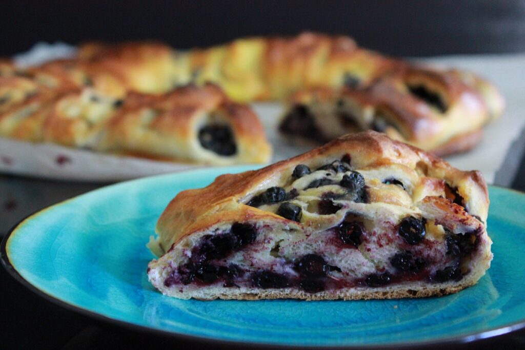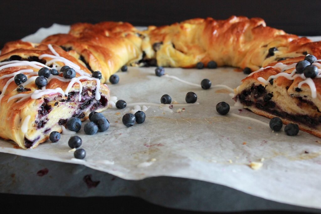 Kjevle deigen i ca. 90 x 30 cm og fyll den med ønsket vaniljekrem og blåbærfyll, eller kortere om du ønsker en tykkere krans enn den jeg har lagd.