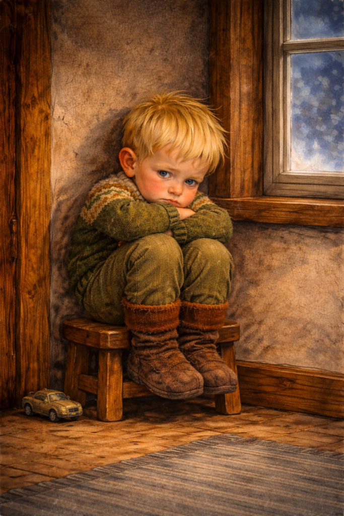 Lars ser på henne og sier, «Nei, jeg vil sitte her til pappa ikke er sint på meg mer.» Moren smiler med øynene, men svaret gjør vondt i hjertet.