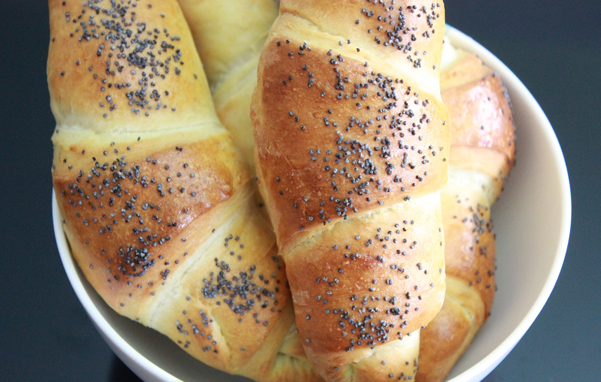 Jeg delte den ferdighevede deigen i to, og kjevlet dem ut i to store sirkler. Disse ble delt i 8 trekanter, og rullet sammen. Hornene ble etterhevet i ca 30 minutter, før jeg penslet dem med egg, strødde på valmuefrø og stekte dem på 210 grader i ca 14 minutter.