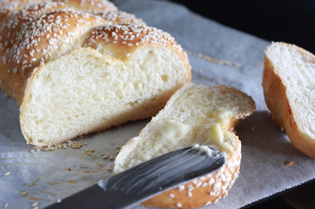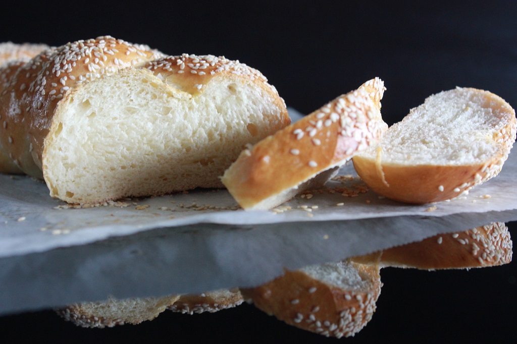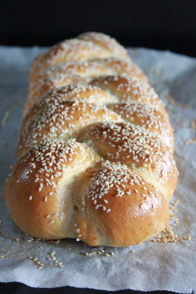 Jeg penslet loffen med egg og strødde over sesamfrø før jeg satte den i ovnen. Vanligvis ville jeg brukt valmuefrø, men fordi jeg ikke hadde mer igjen av det, falt valget på sesamfrø.