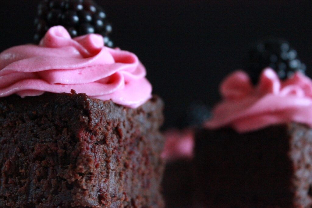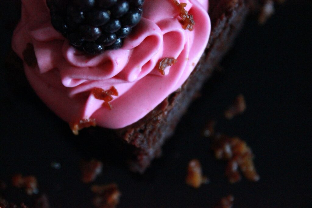 Når jeg hadde bestemt meg for rødbeter i brownien, så jeg for meg en rosa krem på toppen og med et bjørnebær på hvert kakestykke. I tillegg hadde jeg lyst til å prøve med sprøstekt bacon på. Det var morsomt å prøve med bacon på, smakte greit, men det ble ingen hallelujastemning av det. Kanskje i en annen kombinasjon, en annen gang.