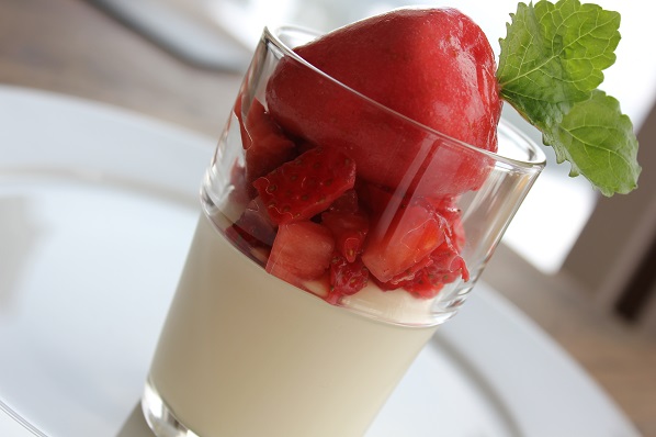 Til dessert hadde jeg allerede planlagt å servere ostekake formet som jordbær (oppskrift finner du her), men siden jeg bare hadde forberedt ett bær til hver, og dette var litt lite, måtte jeg finne på noe annet også. Valget falt på ostemousse toppet med friske jordbær.