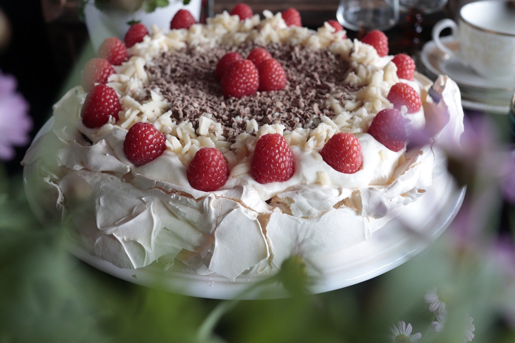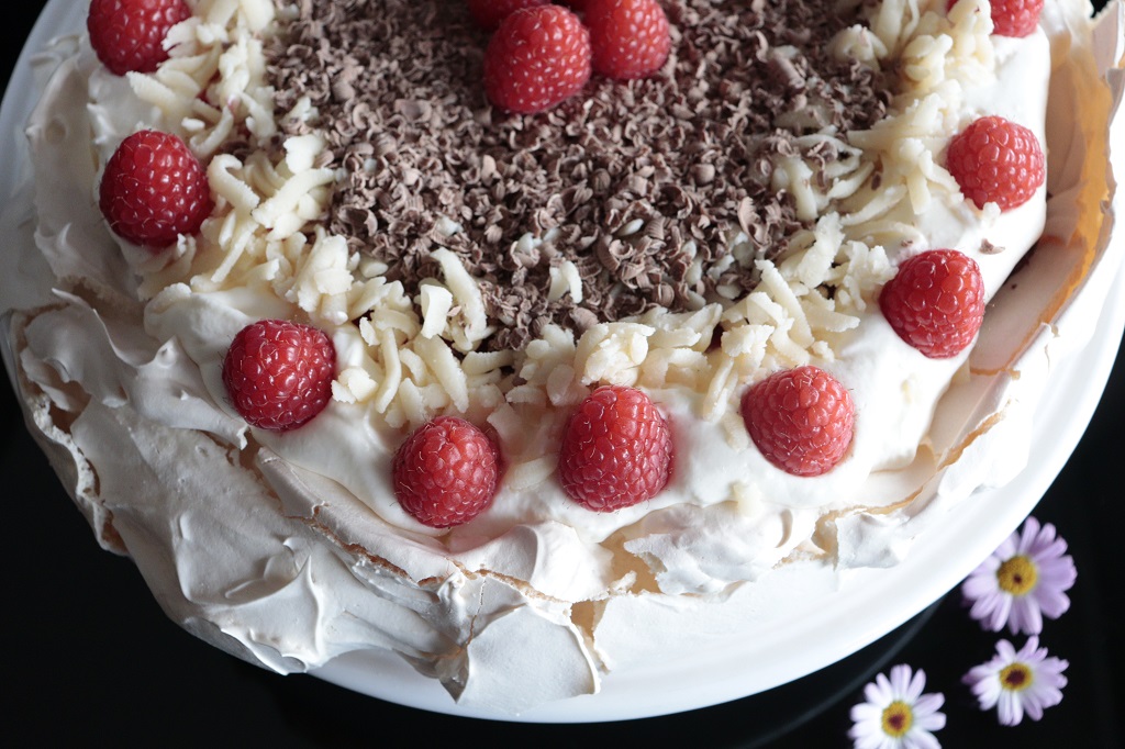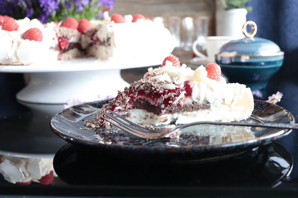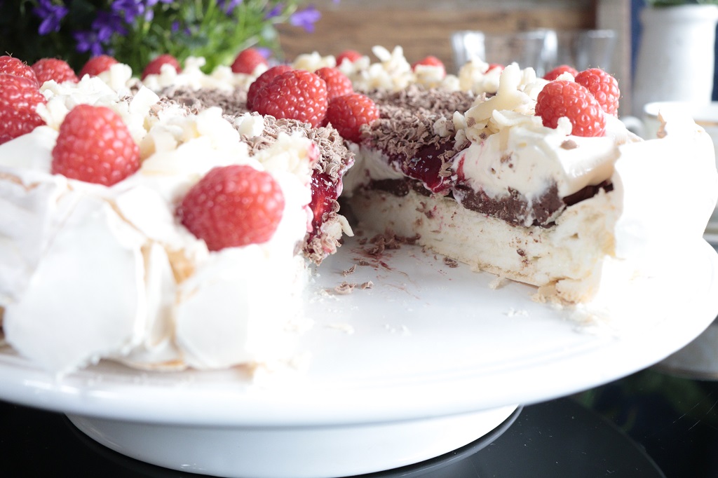 Troika-inspirert Pavlova! Jeg måtte bare prøve meg på en Pavlova med noen av smakene fra Troika – Marsipan, sjokolade og bringebærgelé. Nougat er ikke helt på lag med mine smaksløker, og fikk dermed ikke være med i denne Pavlovaen.