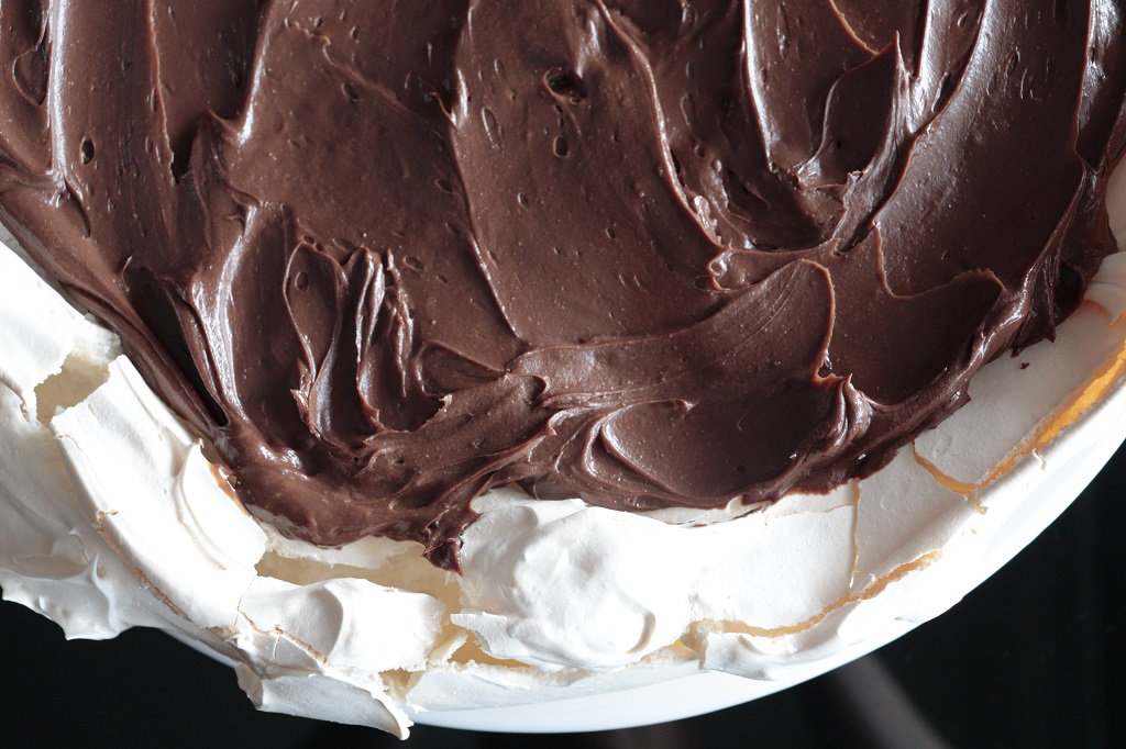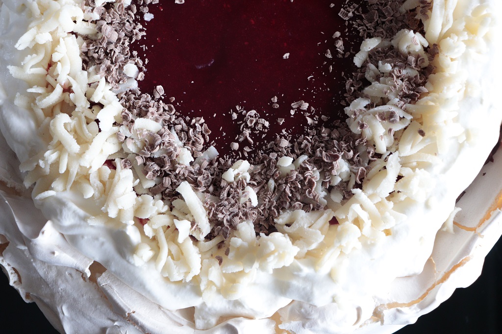 Fra bunnen smurte jeg sjokolade-ganache, deretter hadde jeg et tynt lag med krem over og brukte resten av kremen til å lage kanter rundt hele Pavlovaen. Dette for å lage et «basseng» til geléen. Langs kanten hvor kremen er, strødde jeg revet marsipan og og så dekket jeg geléen med revet sjokolade.