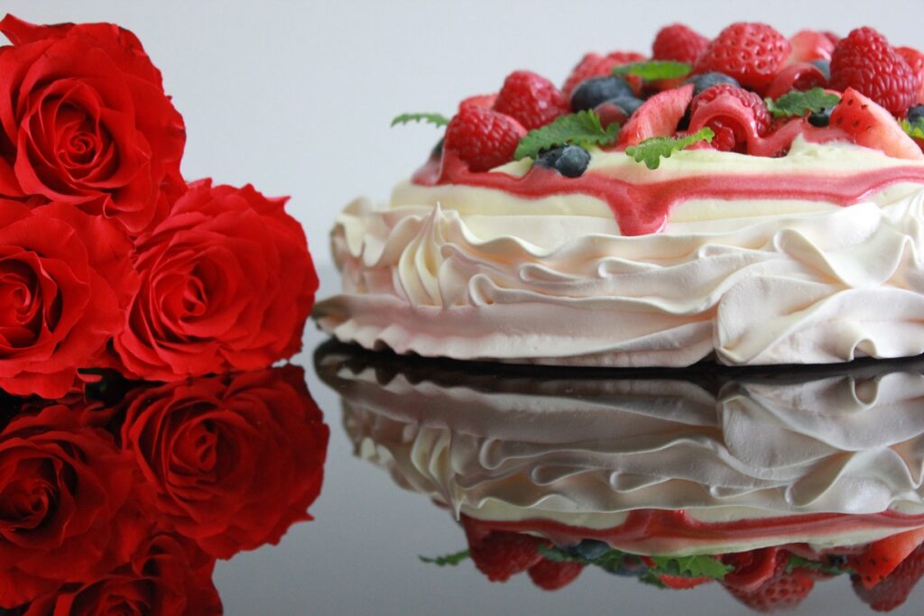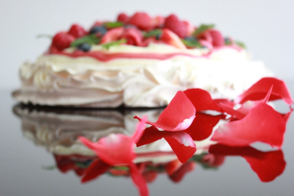 Fordel marengsen hvordan du vil ha den. Jeg hadde marengsen i en sprøytepose og lagde en rund bunn som var 22 cm i diameter med dobben bunn (sprøytet to lag oppå hverandre) og kant. I tillegg lagde jeg noen små marengser som jeg hadde planer om å bruke som pynt på kaken. Det ble ikke noe kakepynt av dem, men de kan jo serveres ved siden av Pavlovaen, eller du kan lage to like store bunner av marengsen, slik at du får en dobbeltdekker. Valget er ditt.