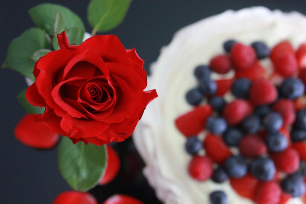 Pavlovaen ble pyntet med vaniljekrem (joda, jeg tør å innrømme at den er kjøpt), friske bær og hjemmelaget bringebær curd. Kaken er sprø i utgangspunktet, så kremen må has på en stund før den skal serveres for at den skal bli mykere.