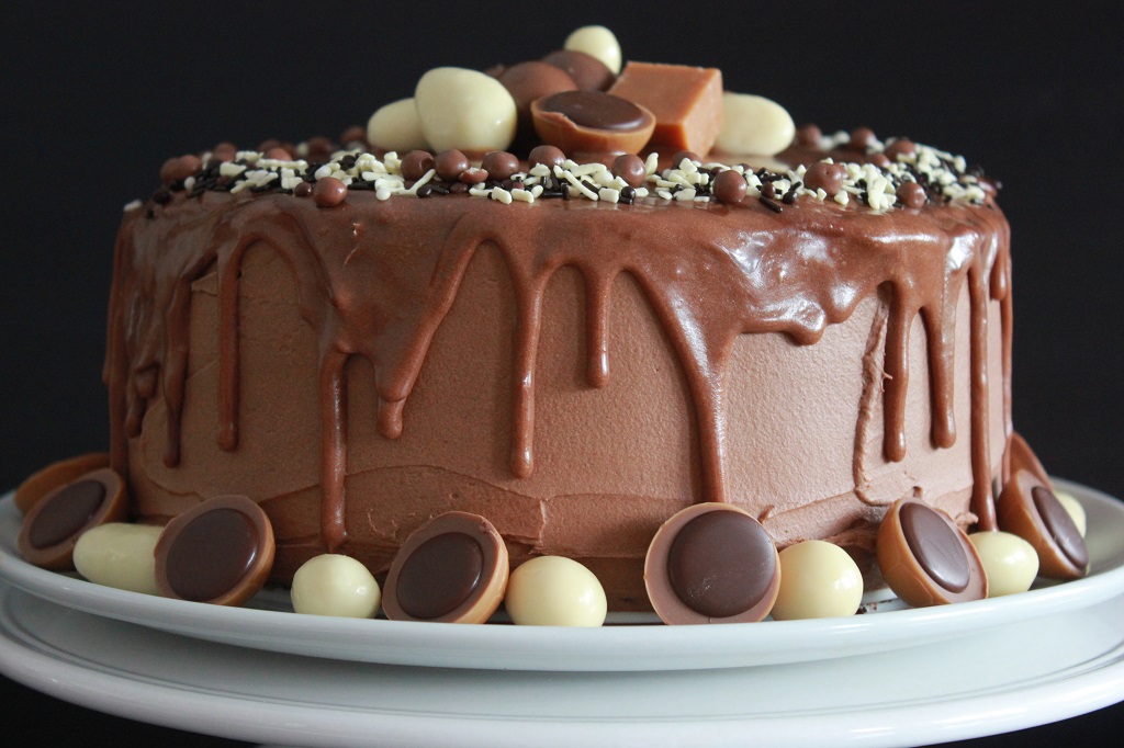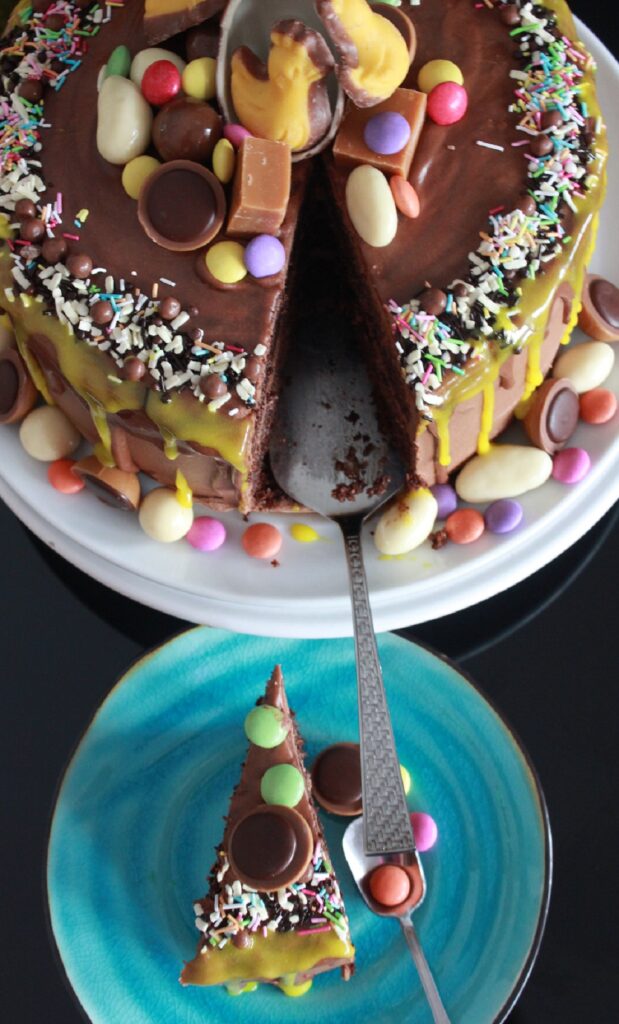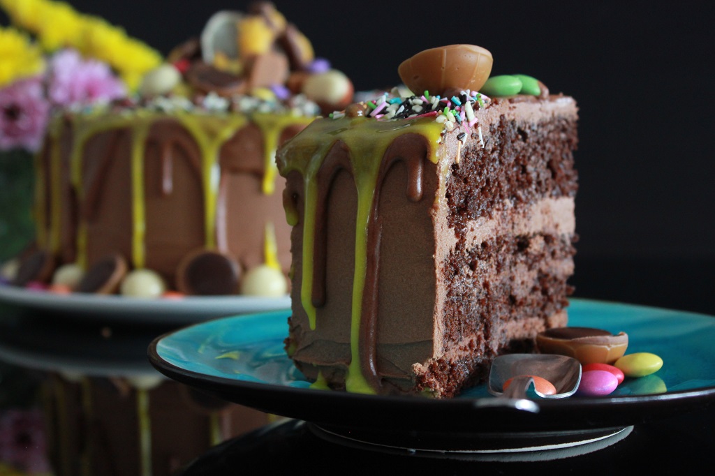 Denne slet jeg med, og til slutt ble den for tynn og for å få den tykkere igjen hadde jeg i melis. Fordi dryppen er med for effekten sin del, gjorde det meg ingenting at den mørke sjokoladesmaken forsvant i søtsmaken til melisen. Det viktigste var at den skulle holde seg på kaka og ikke renne helt av.