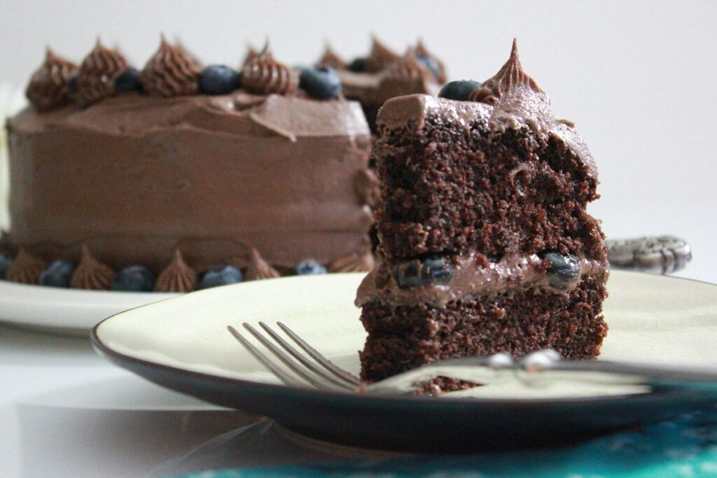 Del kaken i to og ha sjokoladesmørkrem og blåbær i midten.