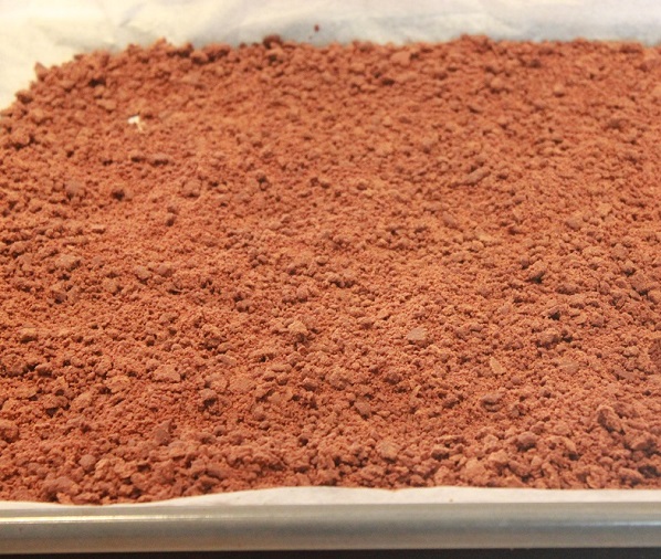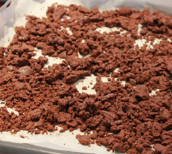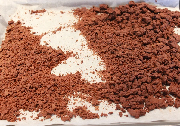 Avkjøl litt og begynn å bearbeide jorden med en skje eller sleiv. Press litt og litt av den ned i langpannen og flytt den fram og tilbake. Etter hvert som sjokoladen kjølner, blir det lettere å «knuse/gruse» den og forme den som man vil.