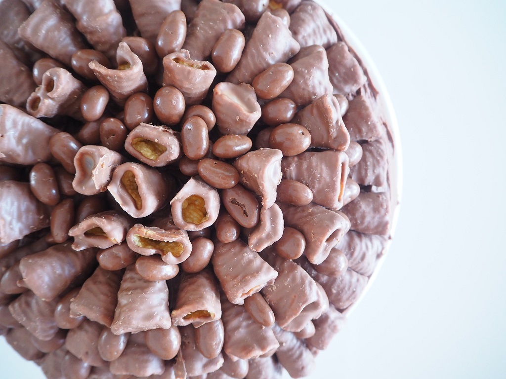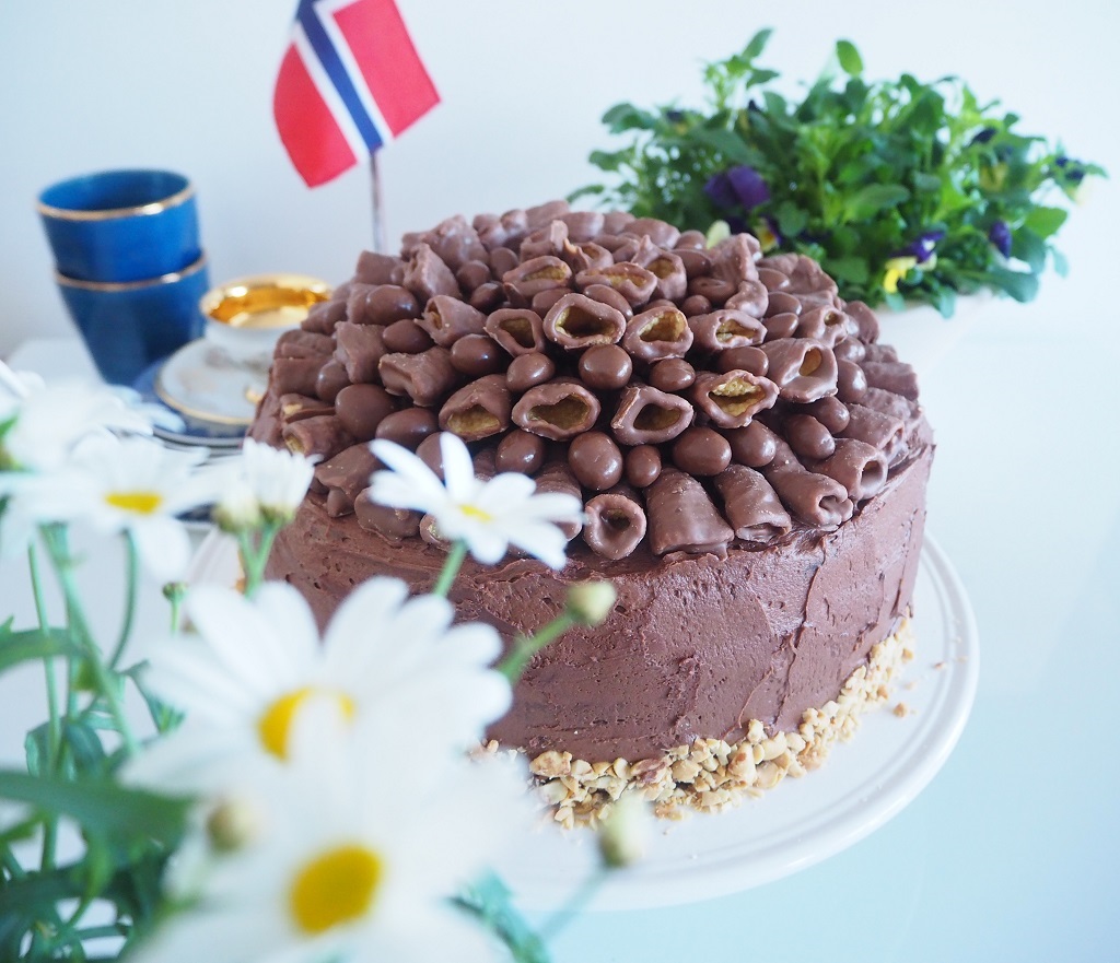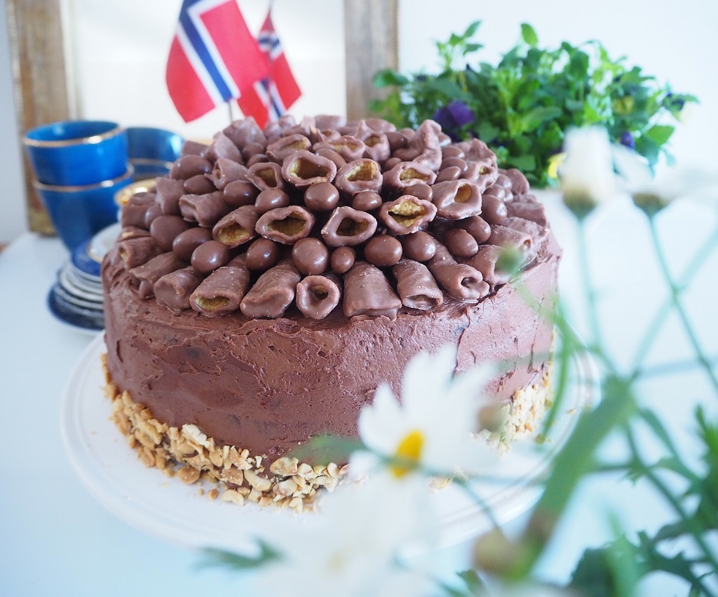 Festkaken er toppet med smash og sjokoladedekte peanøtter. Rundt kanten nede på kaken har jeg brukt hakkede peanøtter.