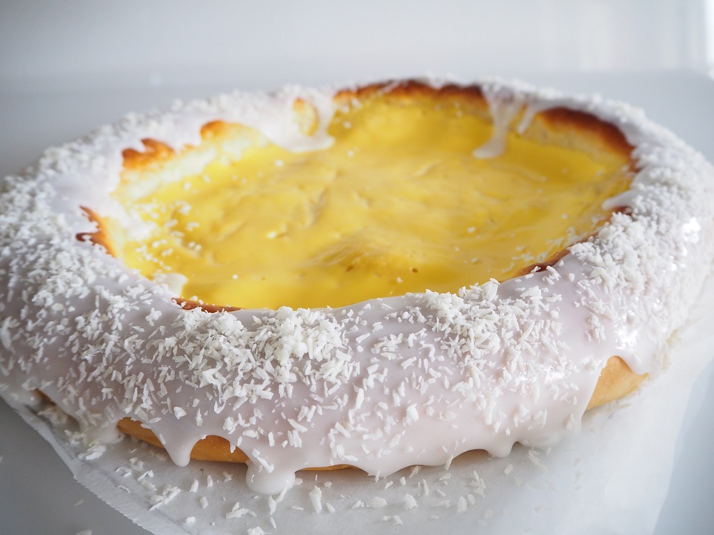 Avkjølt skolebrød eller -bolle om du vil, pyntes med ønsket mengde melis og kokos.