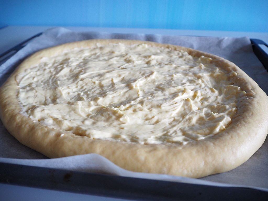 Kjevle en sirkel. Den trenker ikke være så stor. Legg denne sirkelen på bakepapiret. Nå kan deigen trykkes/jobbes fra midten av sirkelen og ut mot kantene. Den skal bli flat på midten og ha kant rundt.